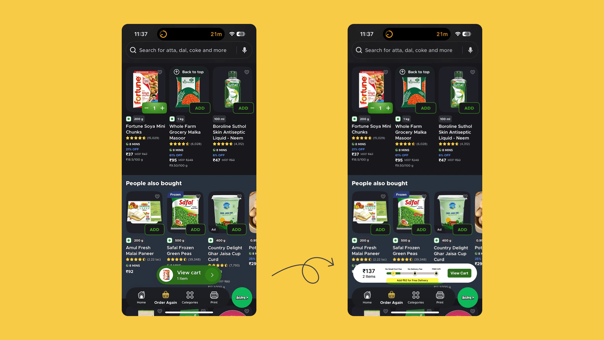 In quick-commerce apps, many smaller orders tend to be refill purchases i.e. items users need quickly rather than part of a planned grocery run. In such situations, users are often focused on speed and convenience, quickly adding items and proceeding toward checkout.